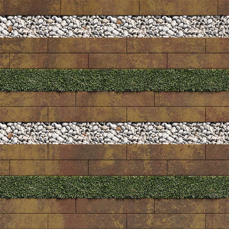 «Экоформа» состоит из бетонного элемента с уширенным швом, что позволяет сочетать бетонные плиты с натуральными материалами и растениями.