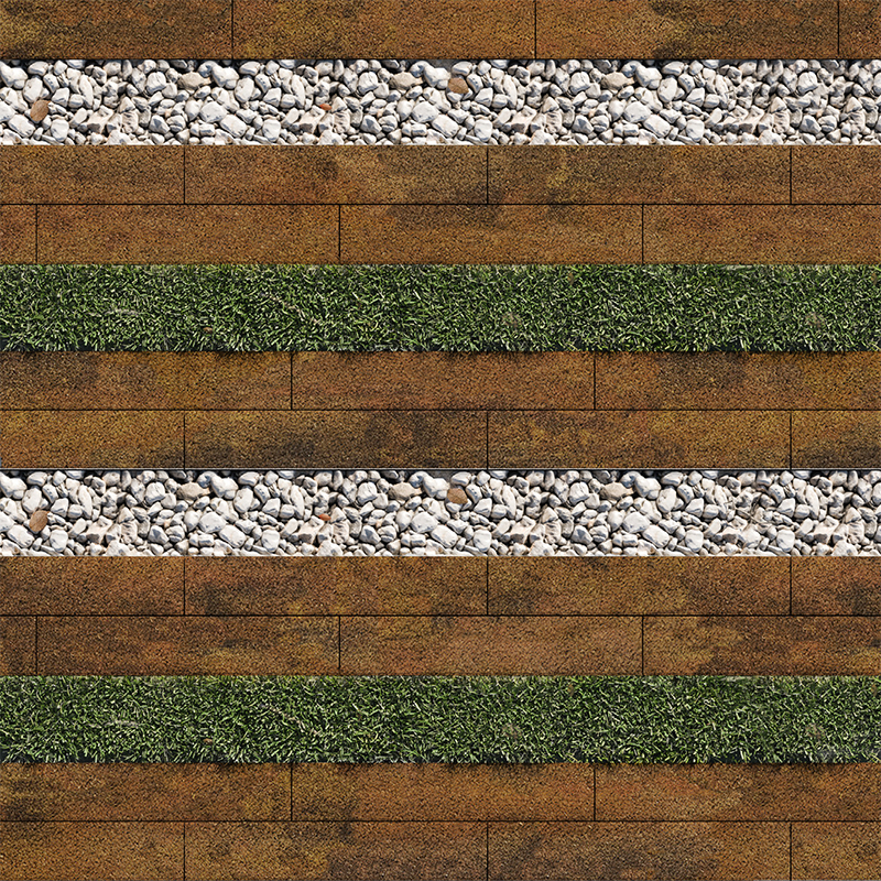 «Экоформа» состоит из бетонного элемента с уширенным швом, что позволяет сочетать бетонные плиты с натуральными материалами и растениями.