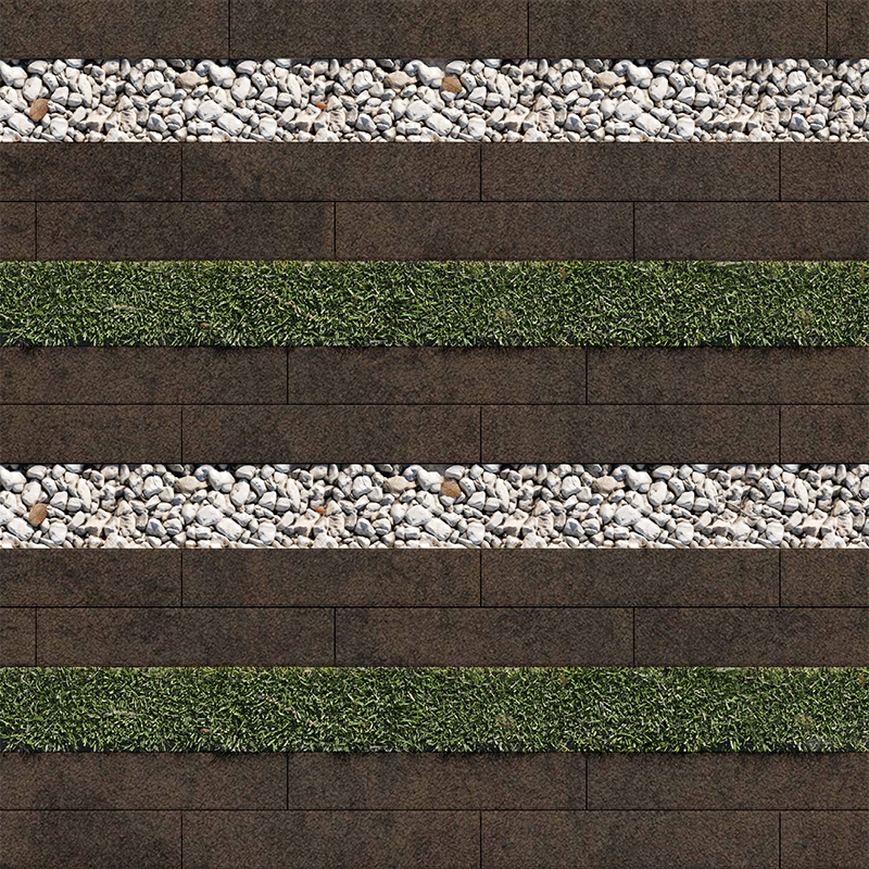 «Экоформа» состоит из бетонного элемента с уширенным швом, что позволяет сочетать бетонные плиты с натуральными материалами и растениями.